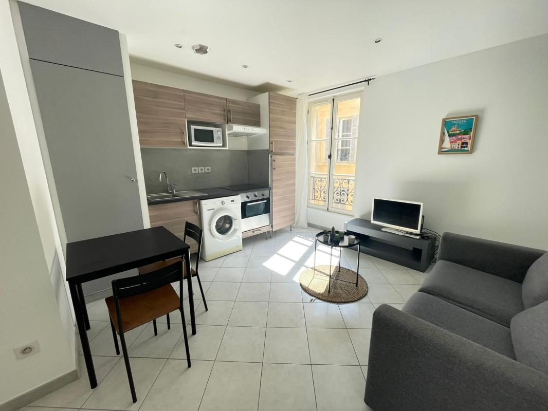 Proche des terrasses du port, en centre ville. Appartement de type 2 meublé situé au 5eme étage sans ascenseur, comprenant une pièce à vivre avec un coin cuisine aménagé et équipé (frigo, micro-onde, four, machine à laver, plaque et hotte) avec vaisselle, télévision, un canapé, une chambre avec lit et placard, une salle d'eau et un wc.